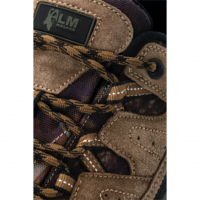 Robuster Outdoorschuh mit Camou Einsätzen. Dieser Schuh ist der ideale Begleiter. Durch die Almtex® Membran ist er wasserdicht und atmungsaktiv, dadurch bleiben die Füße auch bei langen Tagen trocken. Durch das Schnürsystem bietet der Schuh optimalen Halt. Hinten wurde eine Lasche angebracht, welche ein Einfaches an- und ausziehen ermöglicht. Farbe: braun mit Camou Einsätzen.