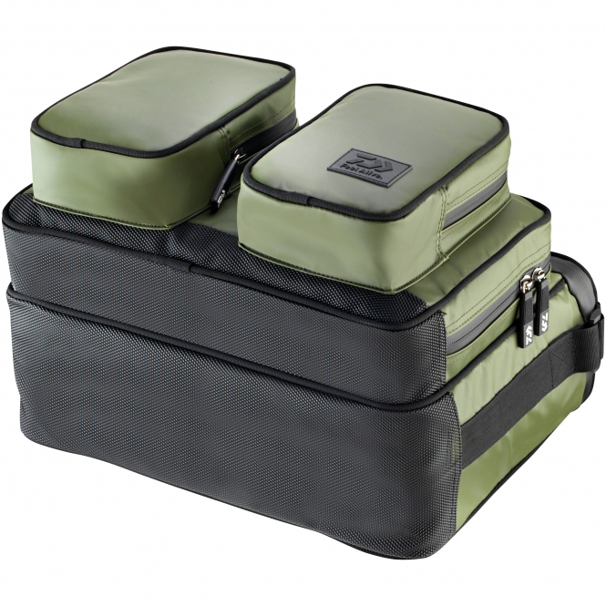 Leichte, robuste Tragetasche aus PVC mit wasserabweisenden Reißverschlüssen und gummiertem Boden. Anti-Slip-Pads verhindern Verrutschen im Boot. Zwei kleine Fronttaschen (20×13×6 cm) bieten zusätzlichen Stauraum, das große Frontfach Platz für eine LR D-VEC-Box oder zwei LS-Boxen. Im Hauptfach sind zwei originale LR D-VEC-Boxen enthalten. Gepolsterter Schultergurt inklusive. Maße: 36 x 25 x 26 cm.