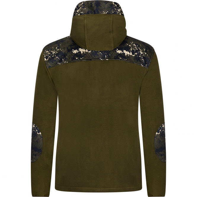 Ein Fleece Midlayer mit hervorragendem Tragekomfort für das ganze Jahr. Mit hohem Kragen, mit Fleece gefütterter Känguru Tasche, großer Bauchtasche und verstellbarer Kapuze. Farbe: oliv mit Kontrast in Digital Camou.