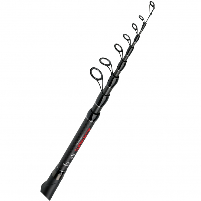 Durch die semiparabolische Aktion des Carbonblanks können Kopfstöße und schnelle Fluchten des Fisches abgefedert werden, jedoch hat man ordentlich Kraftreserven, um den großen Fang sicher zu landen. Mit einer Vollcarbonspitze.