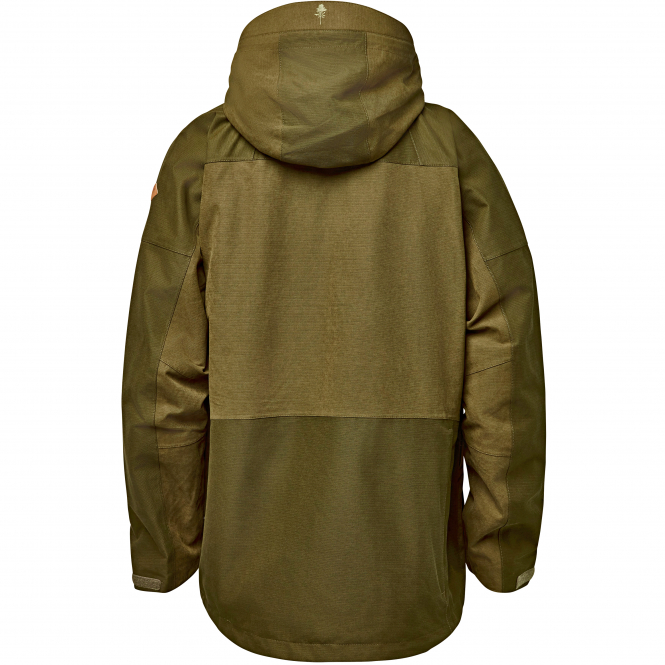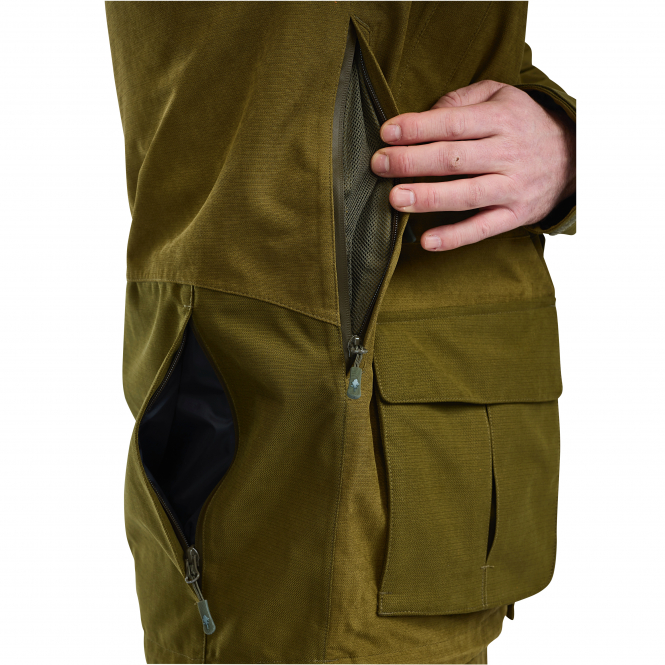 Jagd- und Outdoor-Anorak mit wind- und wasserdichter Membran und einer Kapuze mit verstärkter Krempe, die vor Regen schützt. Farbe: oliv.