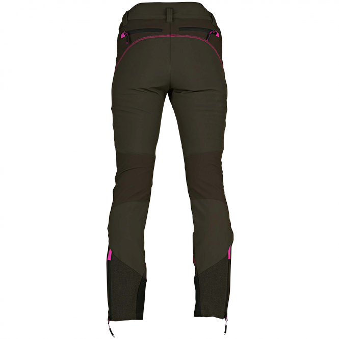 Eine Hose aus elastischen Softshell-Material mit U-Tex Membran. Wasserdicht: 5.000 mm. Atmungsaktiv: 3.000 g/m²/24h. Ideal für Outdoor-Aktivitäten bei niedrigen Temperaturen. Mit vielen Taschen und pinken Kontrasten aus RK-Tex-Gewebe. Farbe: oliv.